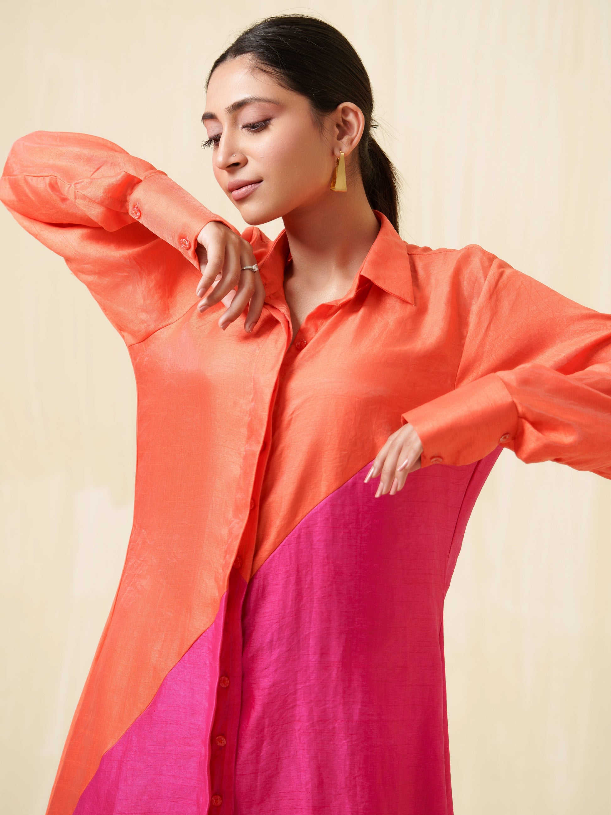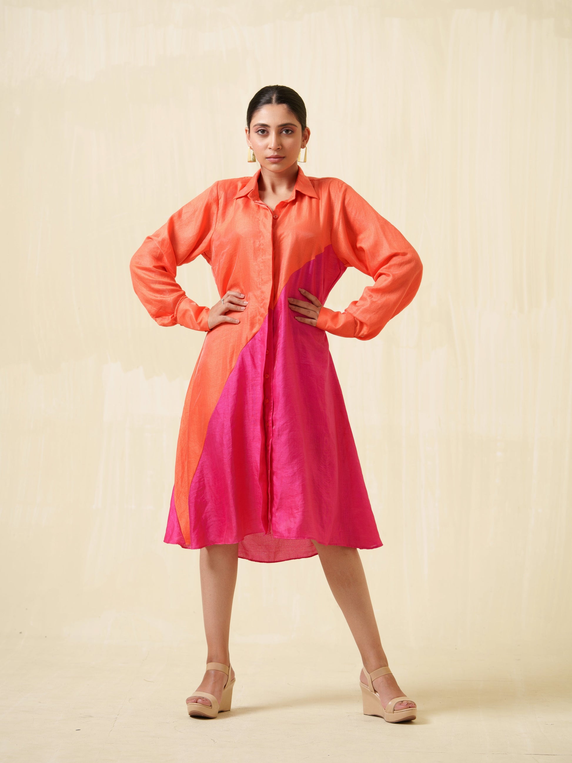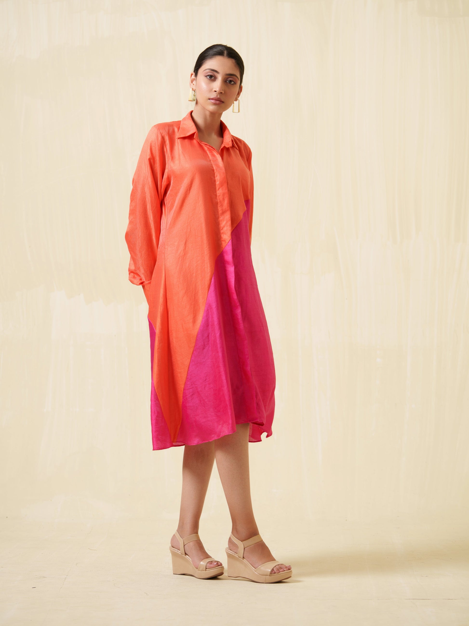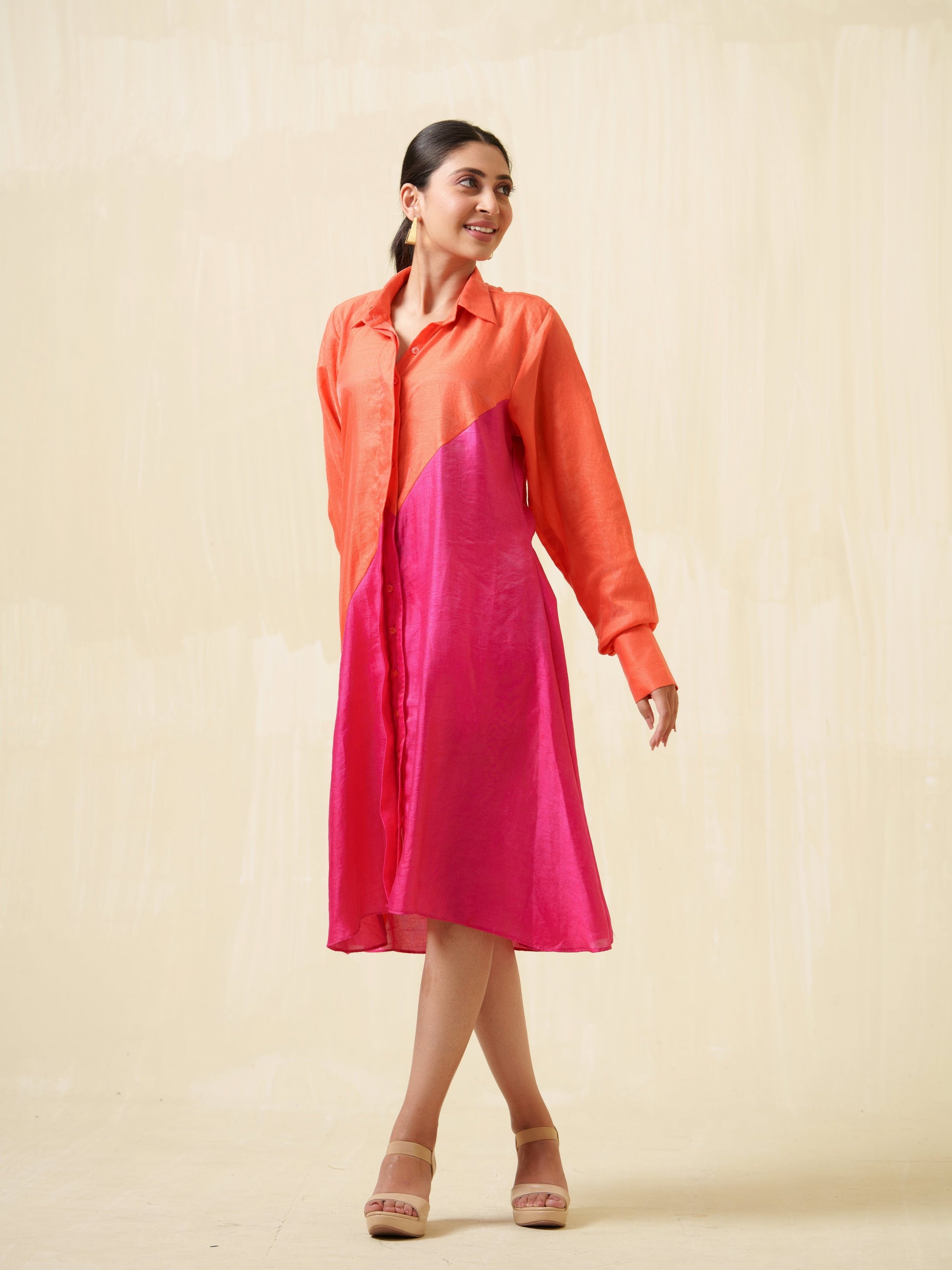This color-blocking dress not only captivates with its bold design but also drapes with exceptional flow and smoothness.