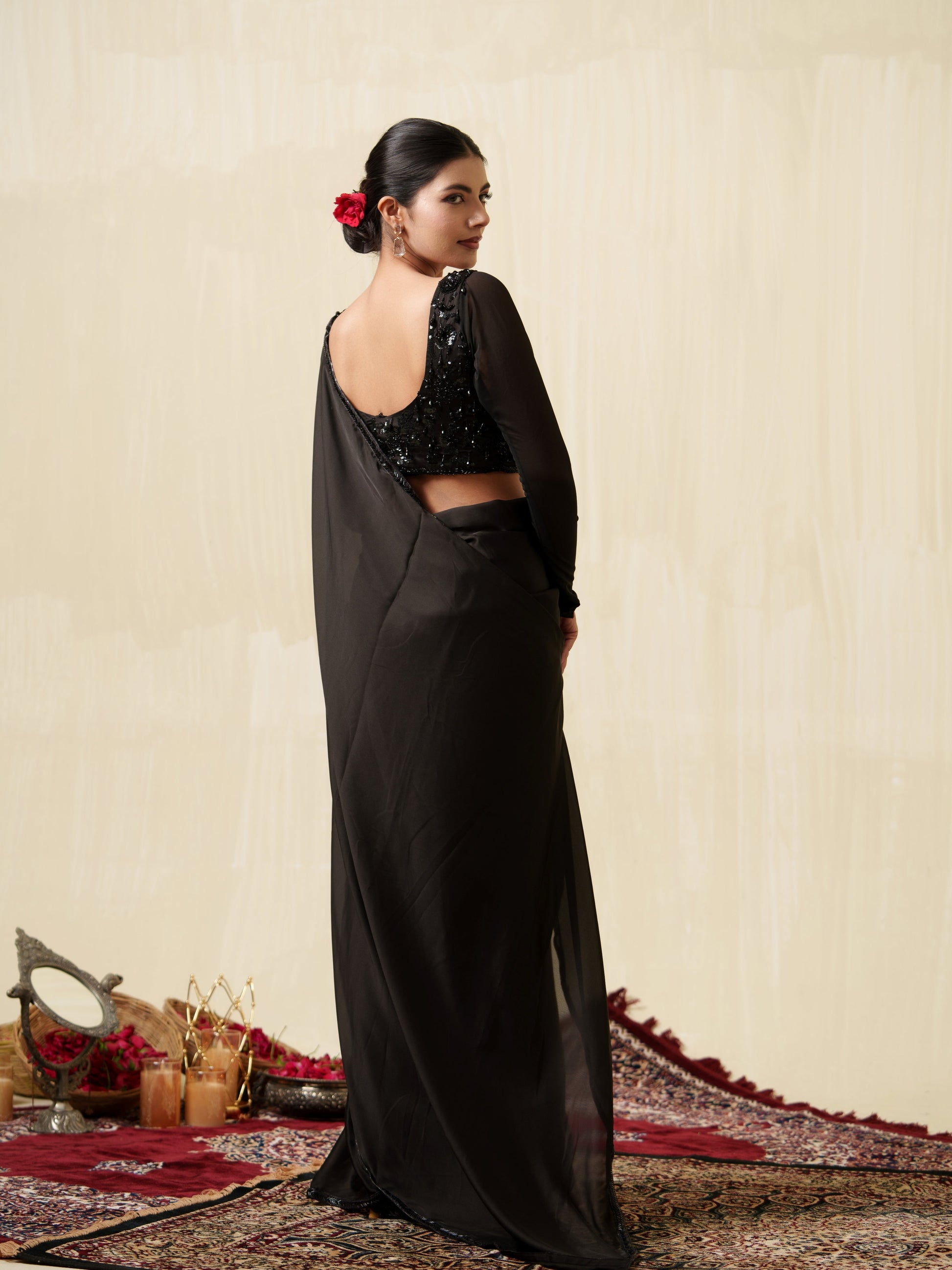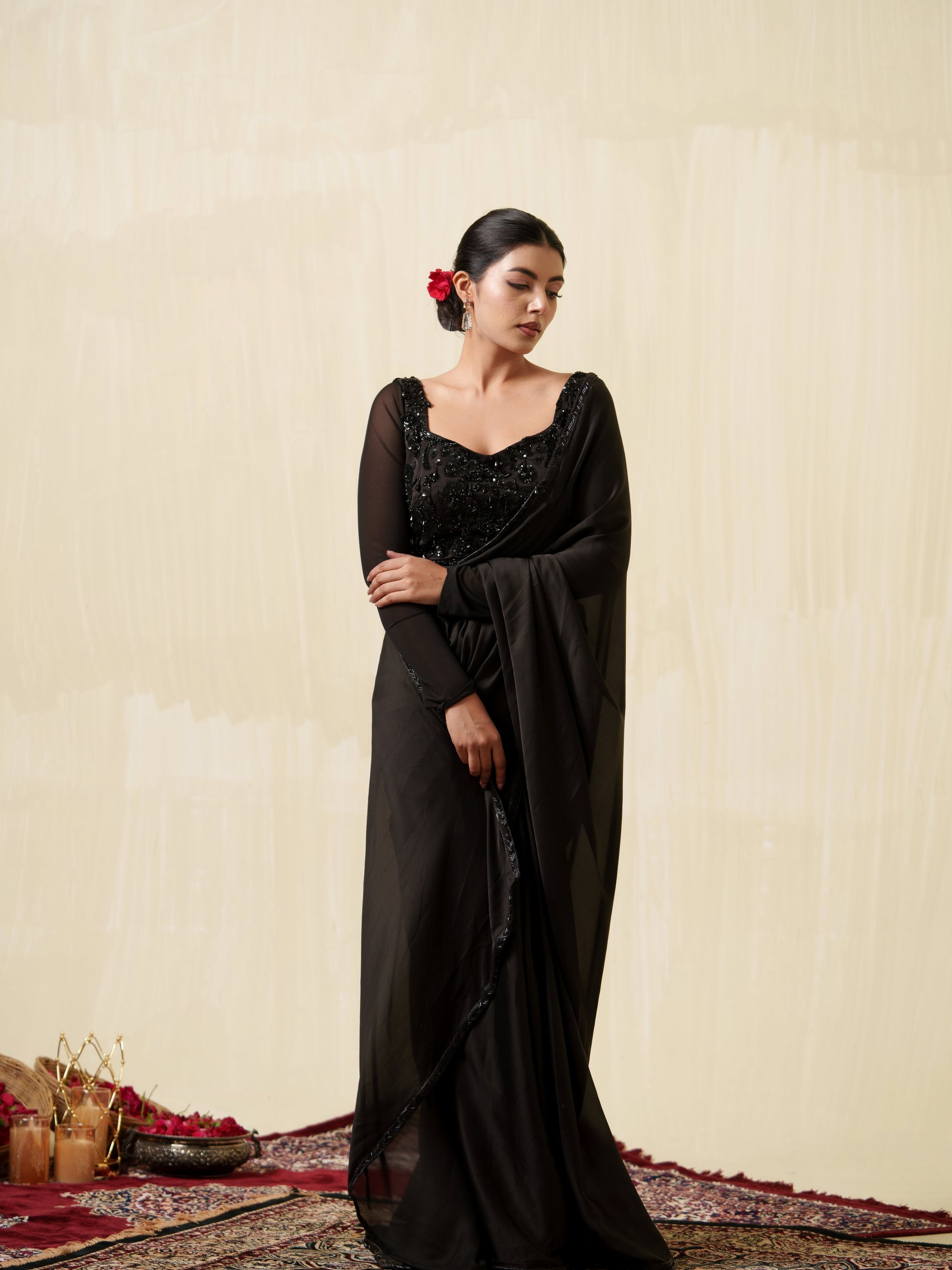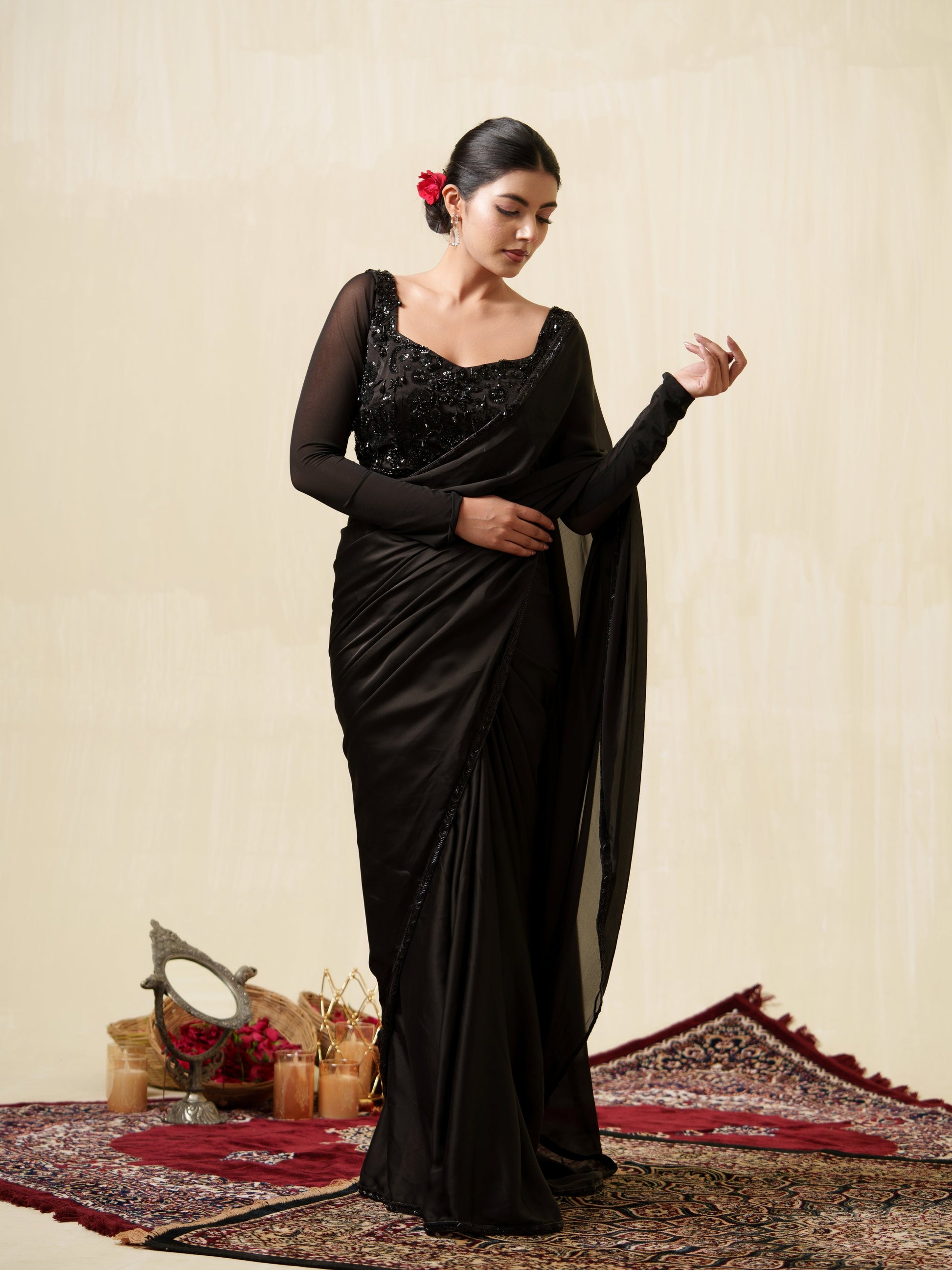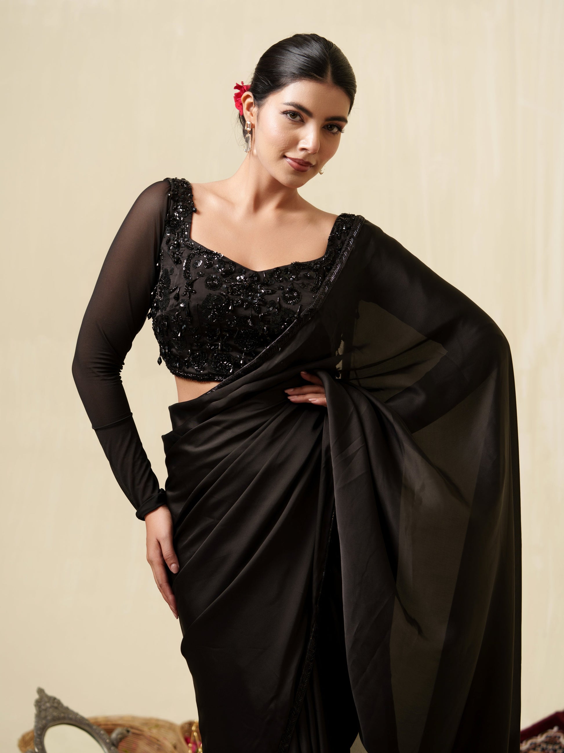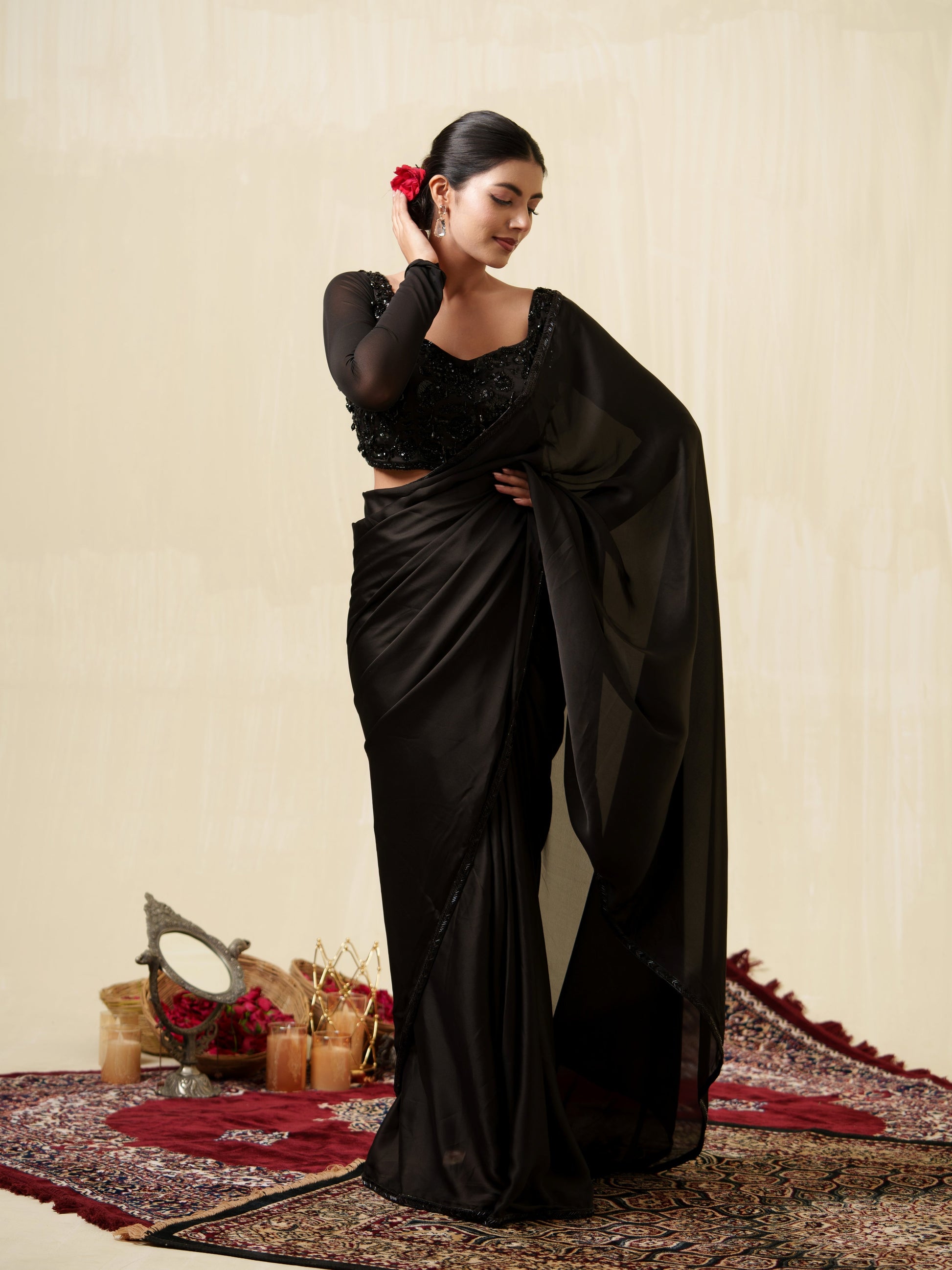 Drape yourself in timeless elegance with this black saree, adorned with delicate lace throughout. The heavy handwork blouse, featuring cascading crystal embellishments, adds a touch of opulence and allure to your look, making it a perfect choice for a sophisticated and glamorous occasion.