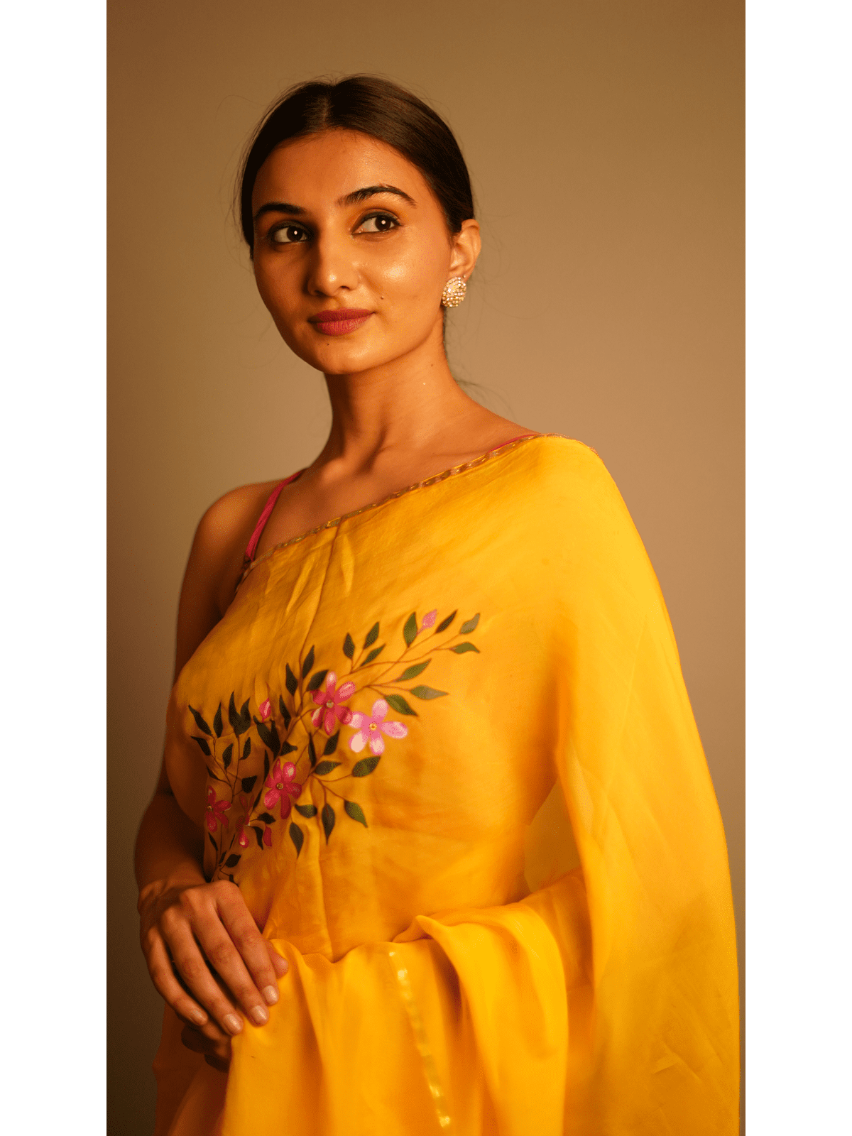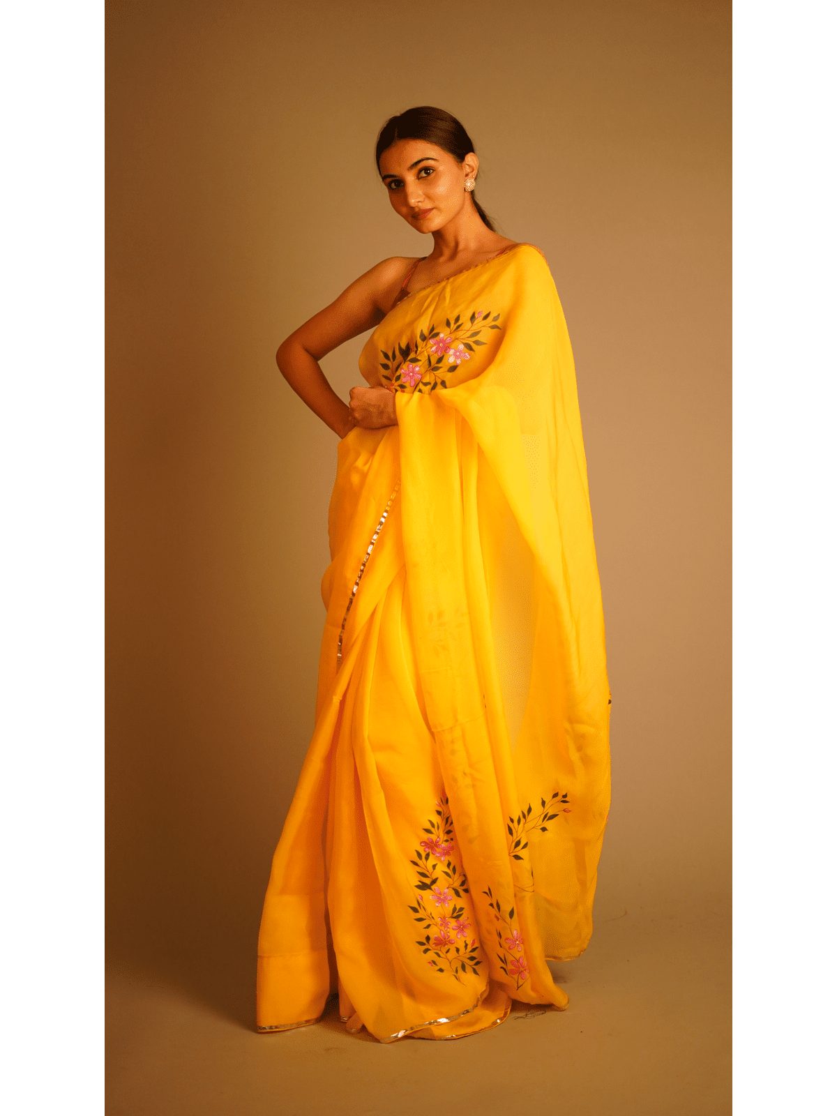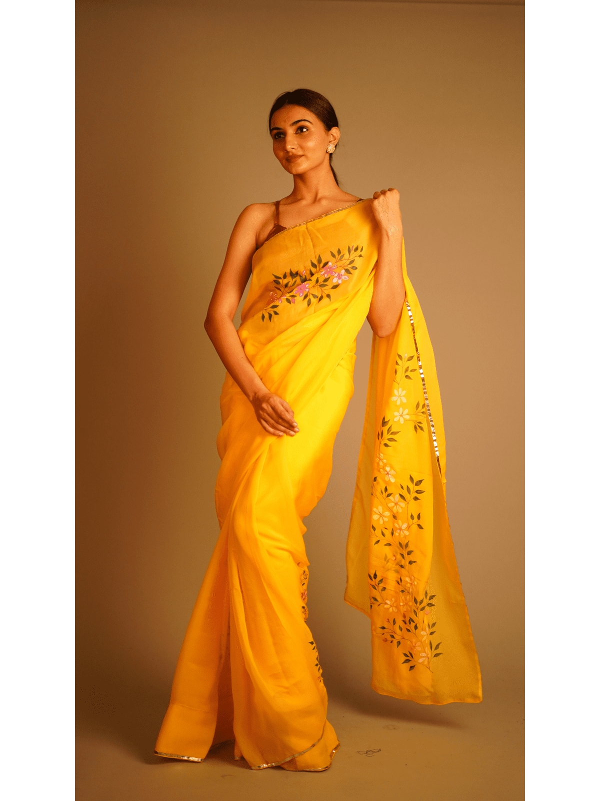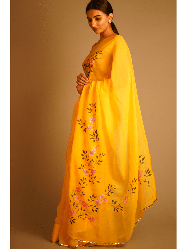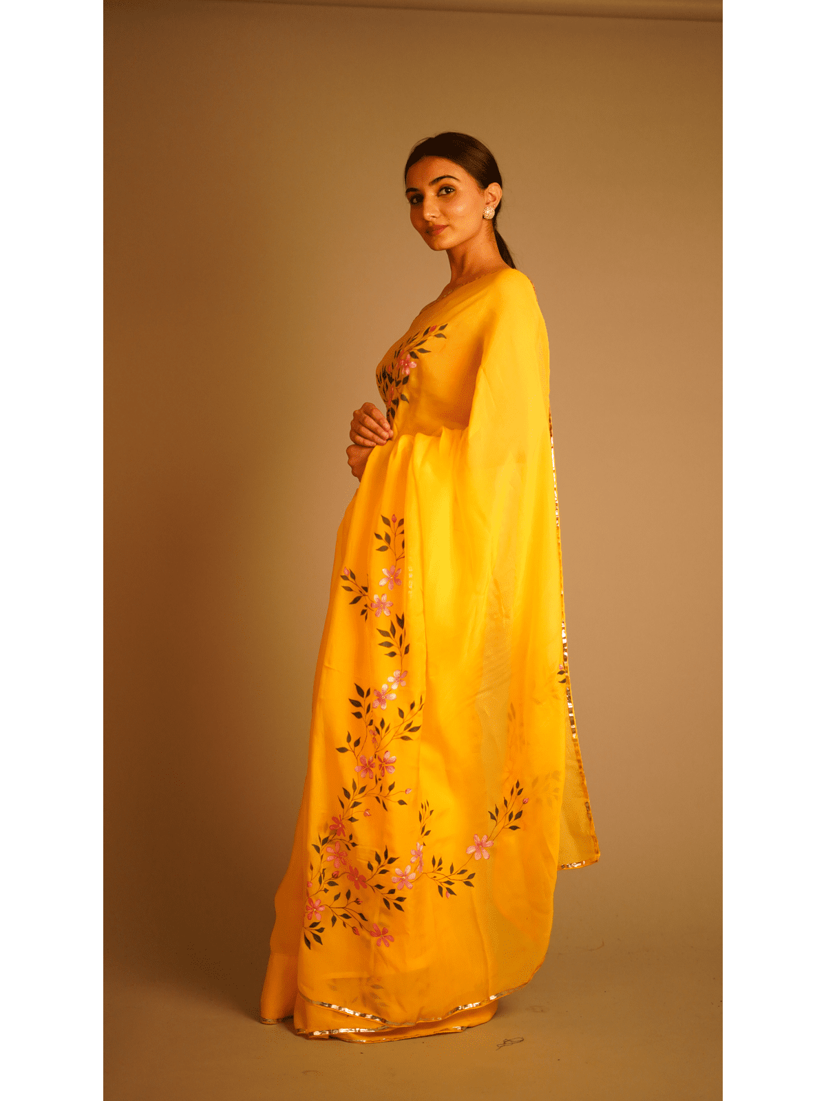 Featuring a summery yellow saree with handpainted flowers and stems throughout the pallu, bottom and the front of the saree. The saree is further accentuated with traditional gota border.