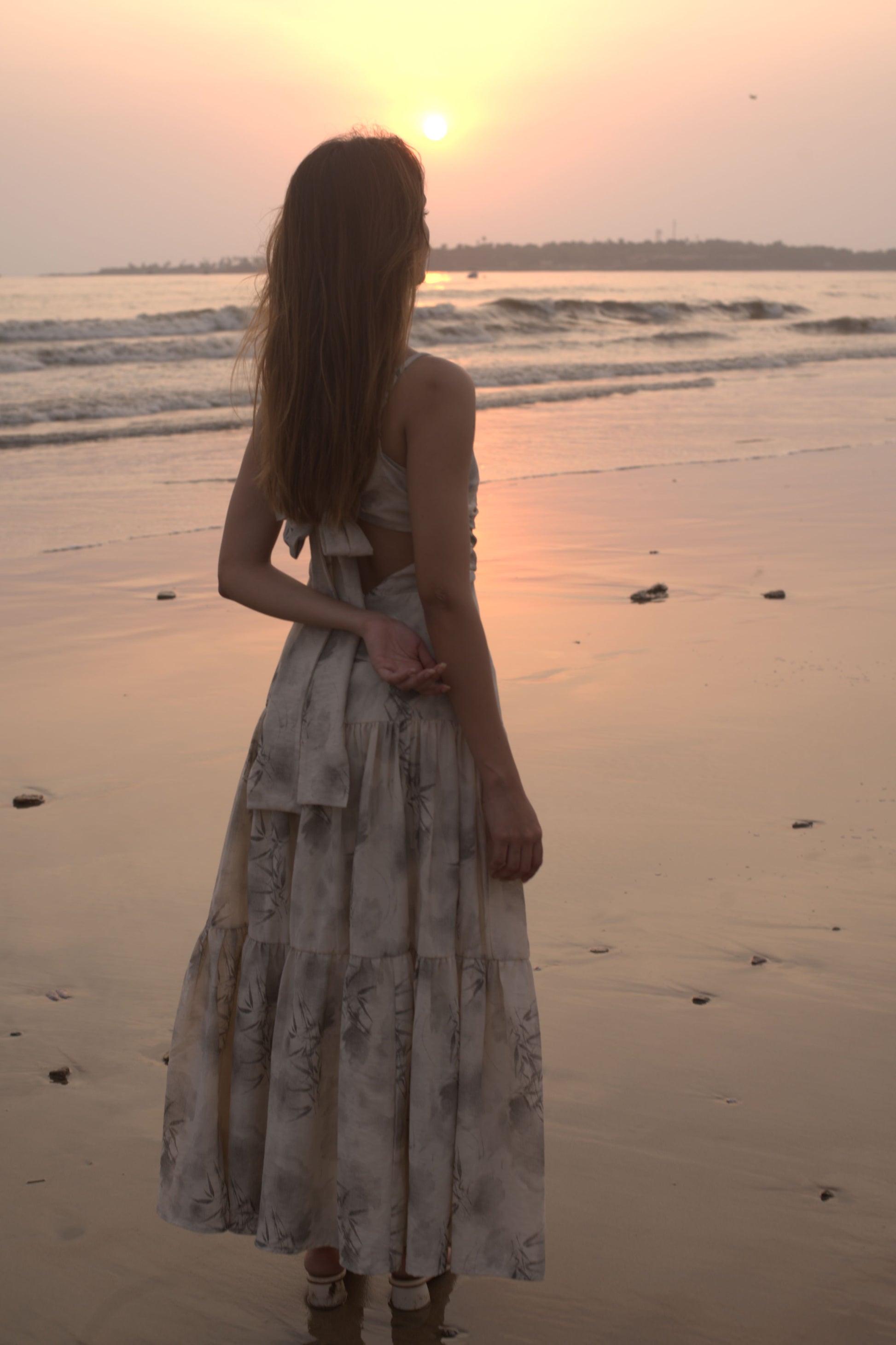 The flowy silhouette accentuates the wearer's grace, while the delicate frills cascade gracefully, adding a touch of whimsy to the classic design.