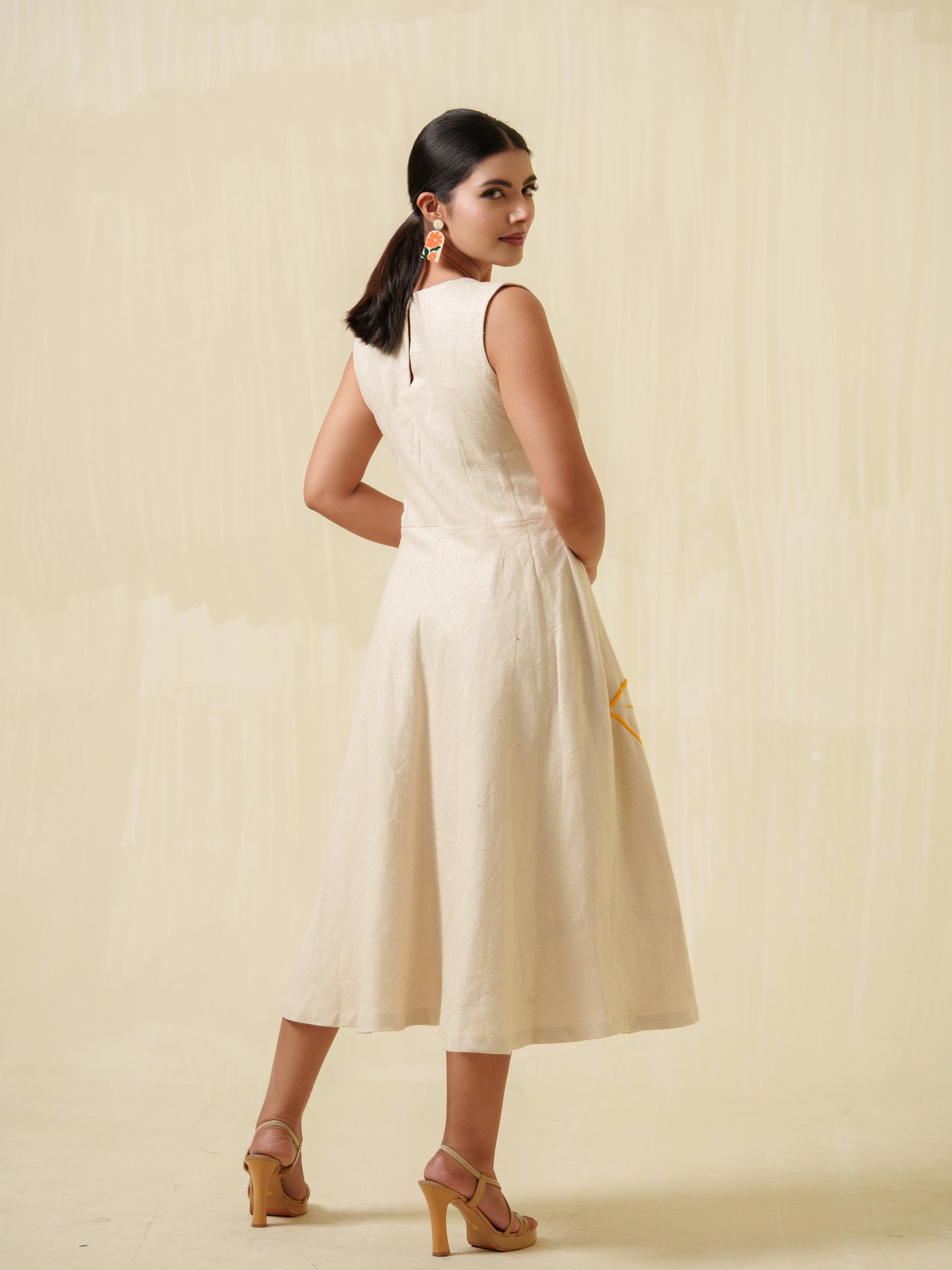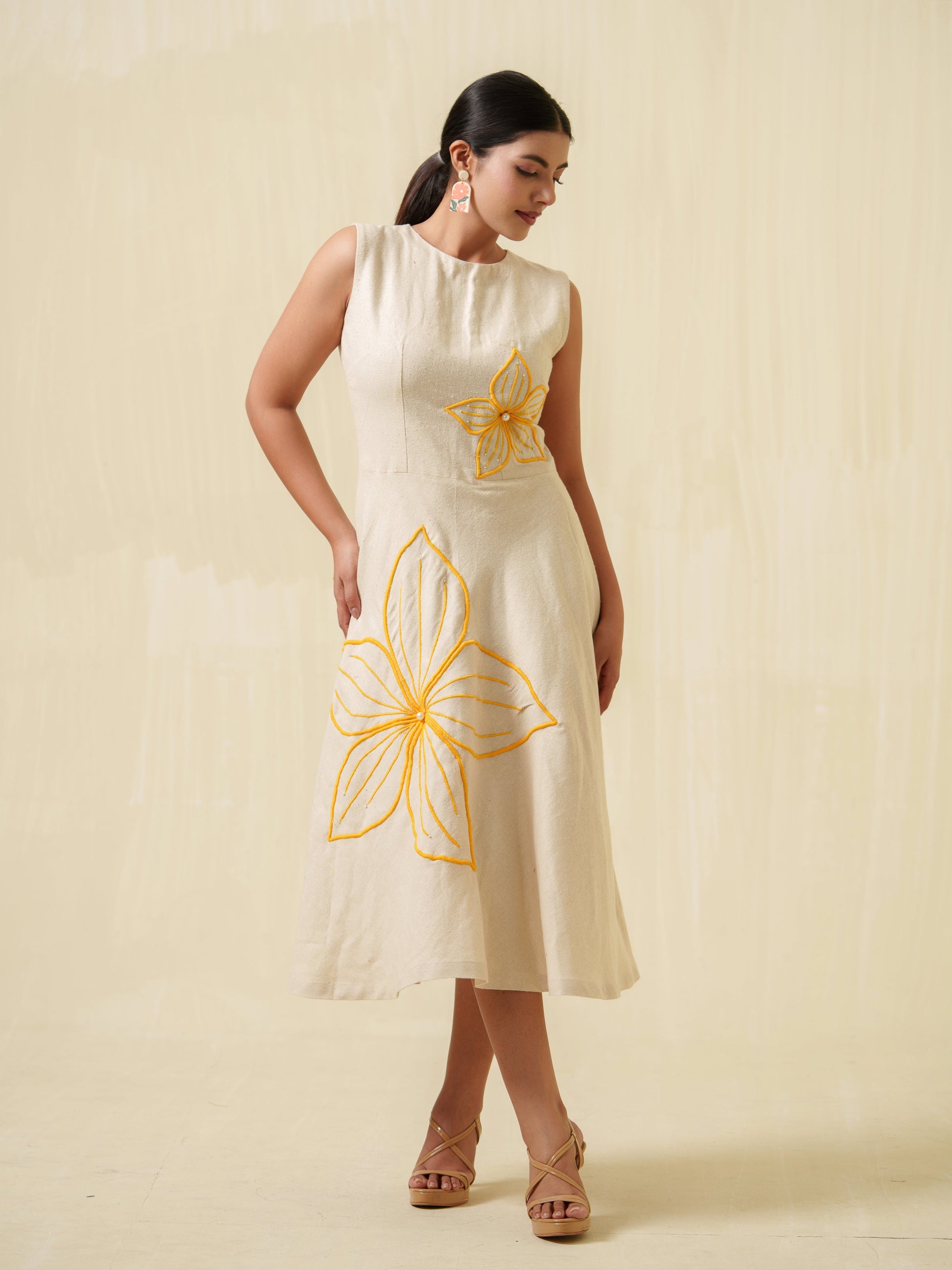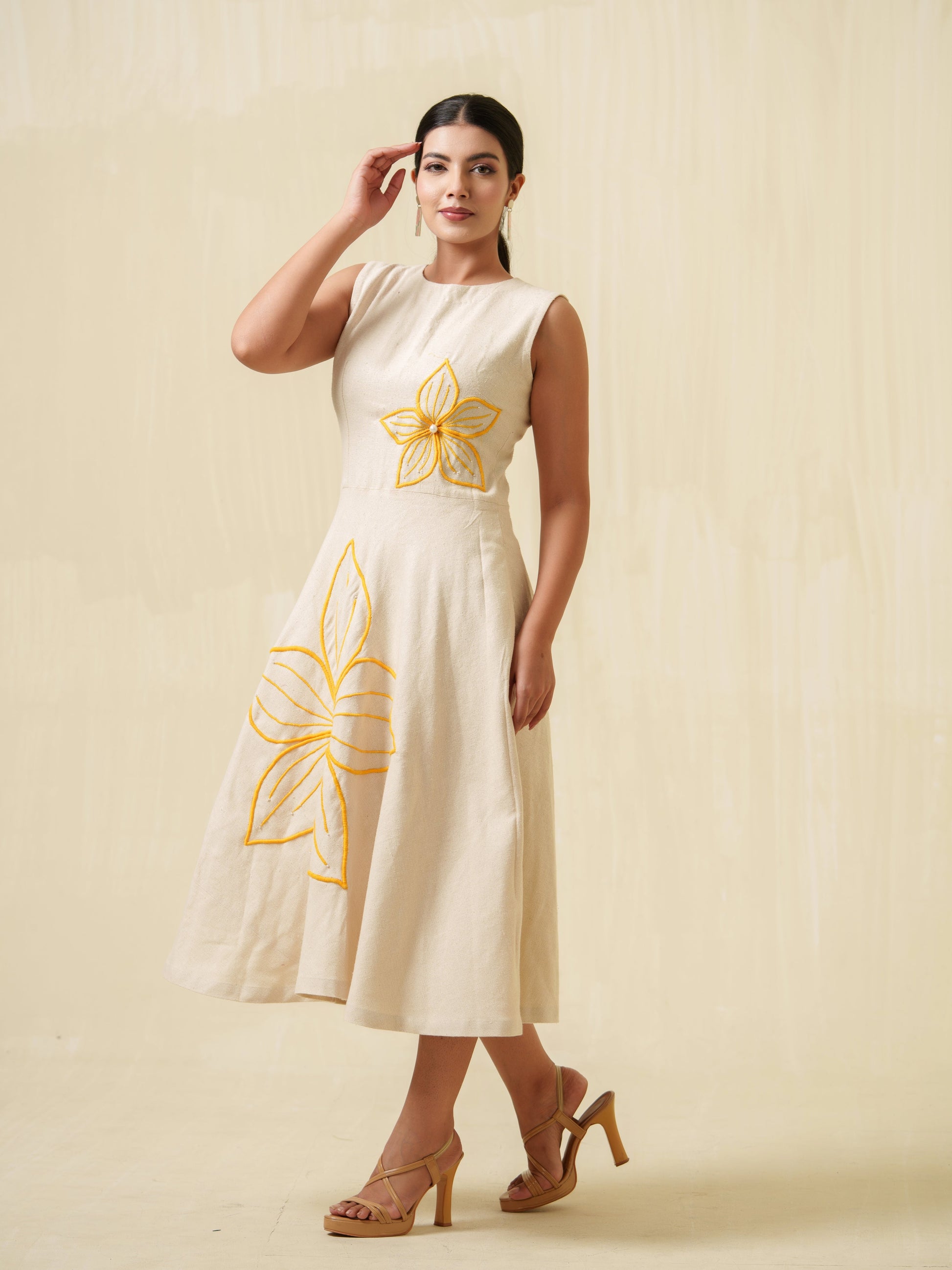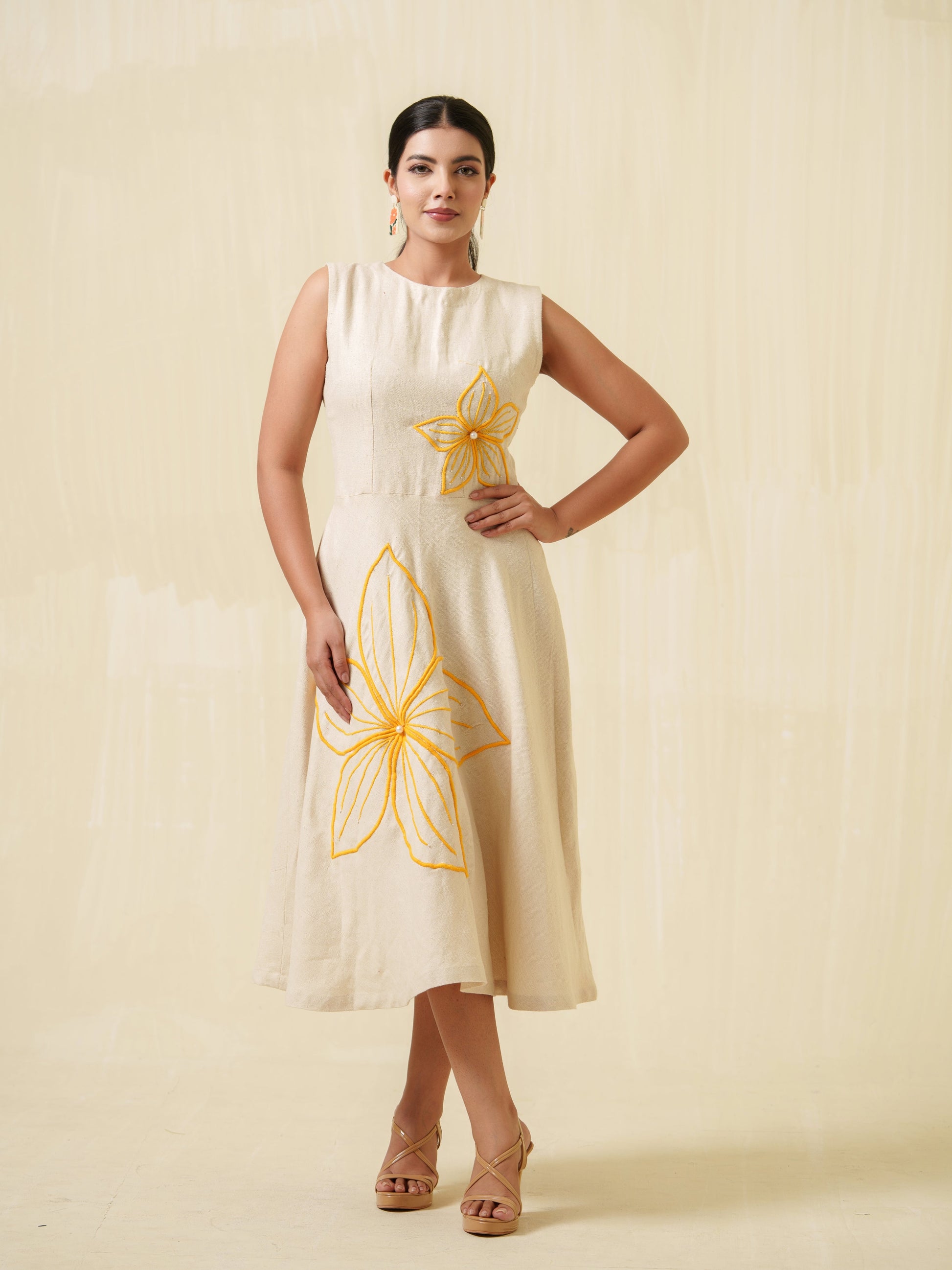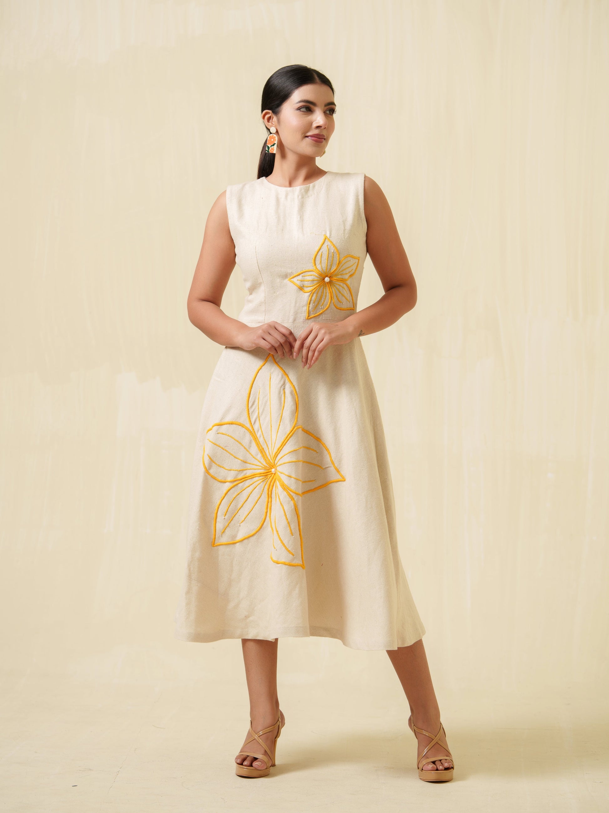 This exquisite dress blooms with intricate flower embroidery, as if a garden came to life on fabric. Each petal and bud is a testament to craftsmanship and natural beauty.