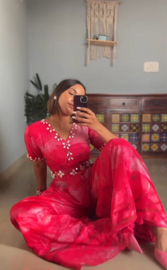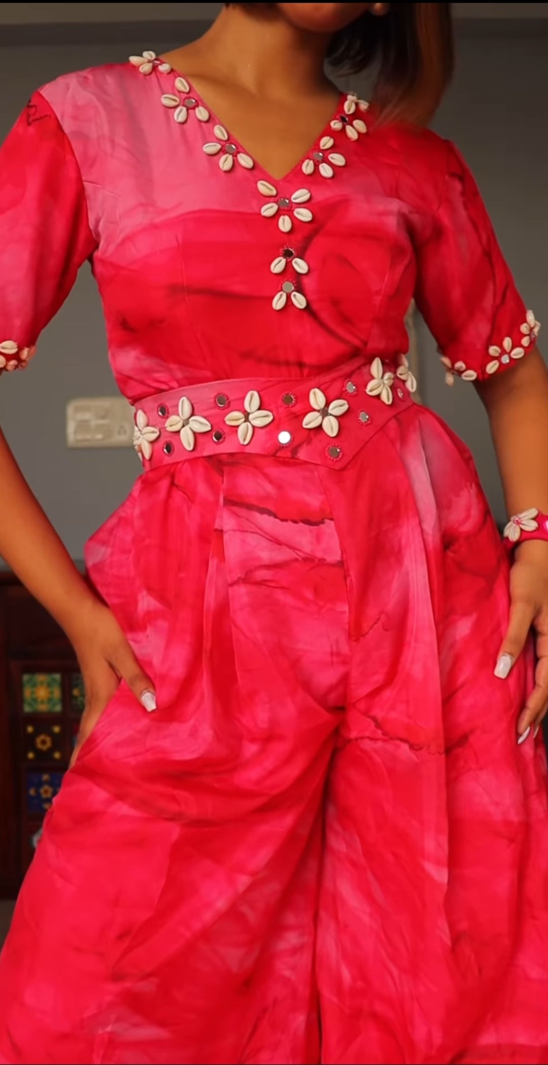 Step into a world of elegance with our exquisite jumpsuit crafted from soft pink marble fabric. Adorned with meticulous artistry, delicate seashells and gleaming mirrors create a stunning symphony across the fabric's surface, forming intricate patterns that dance in the light. This jumpsuit blends the timeless allure of nature's treasures with contemporary design, offering a unique and captivating ensemble that effortlessly merges sophistication with artistry.