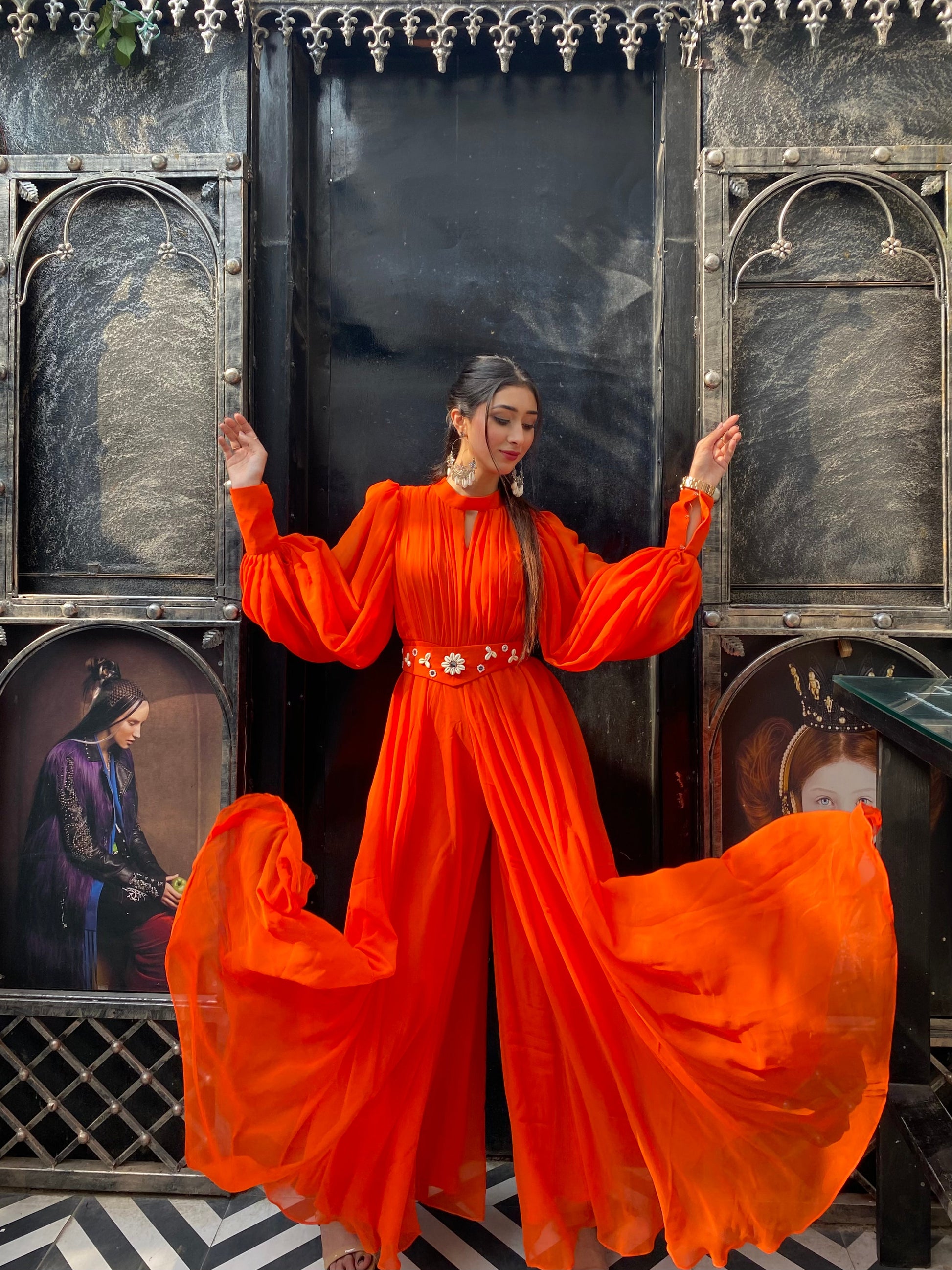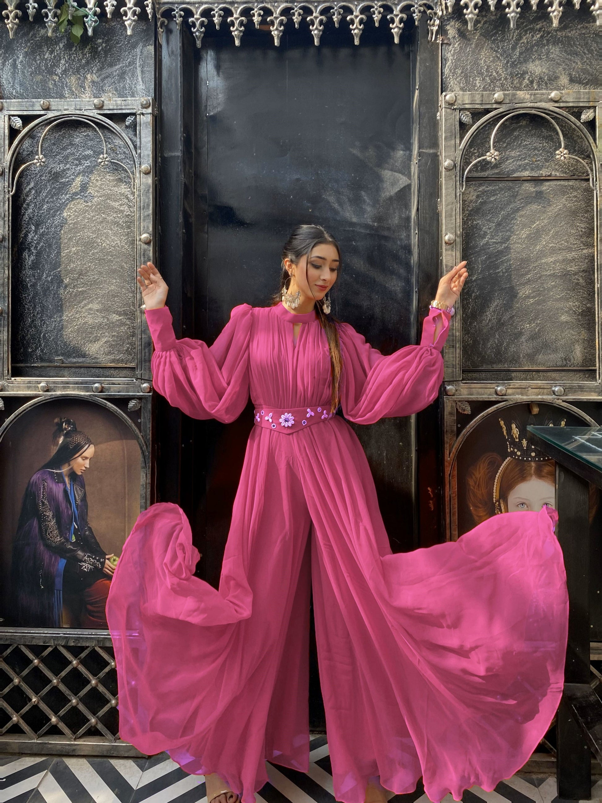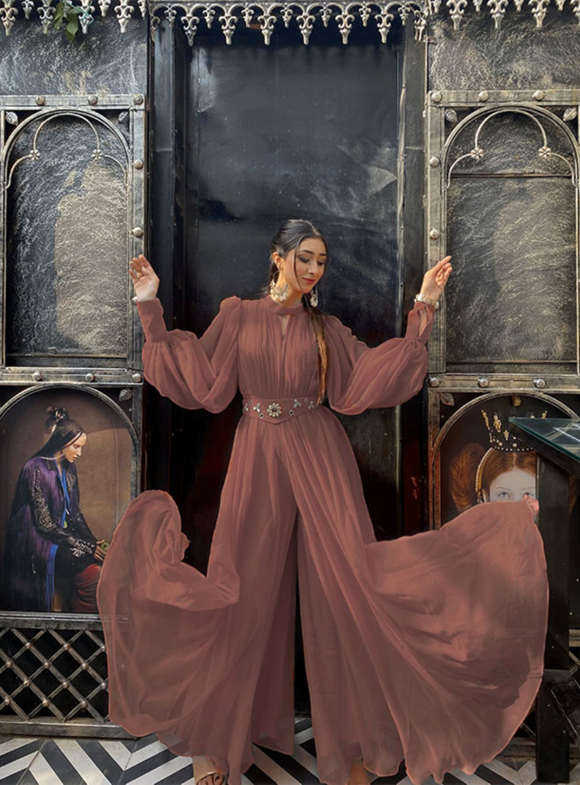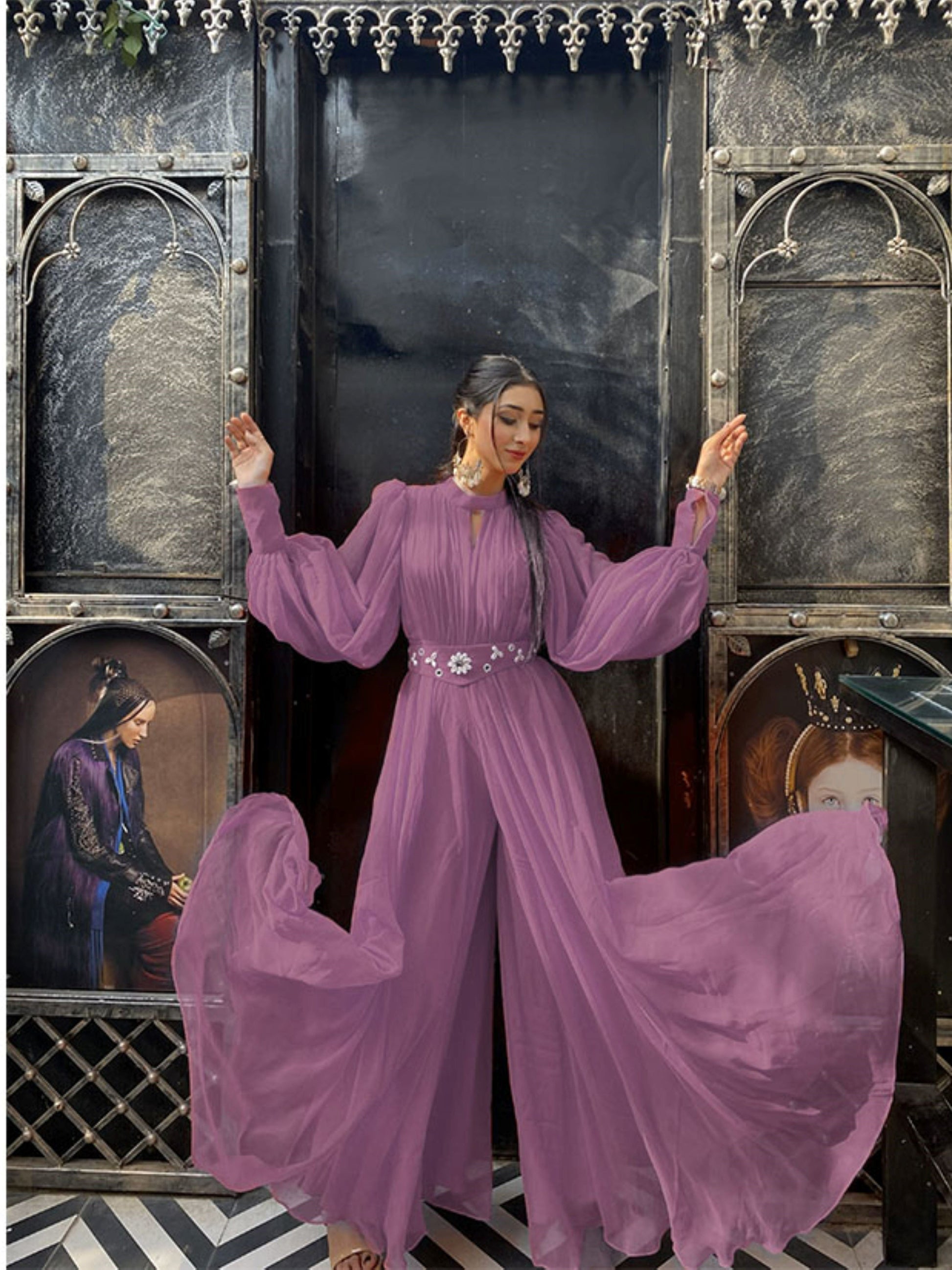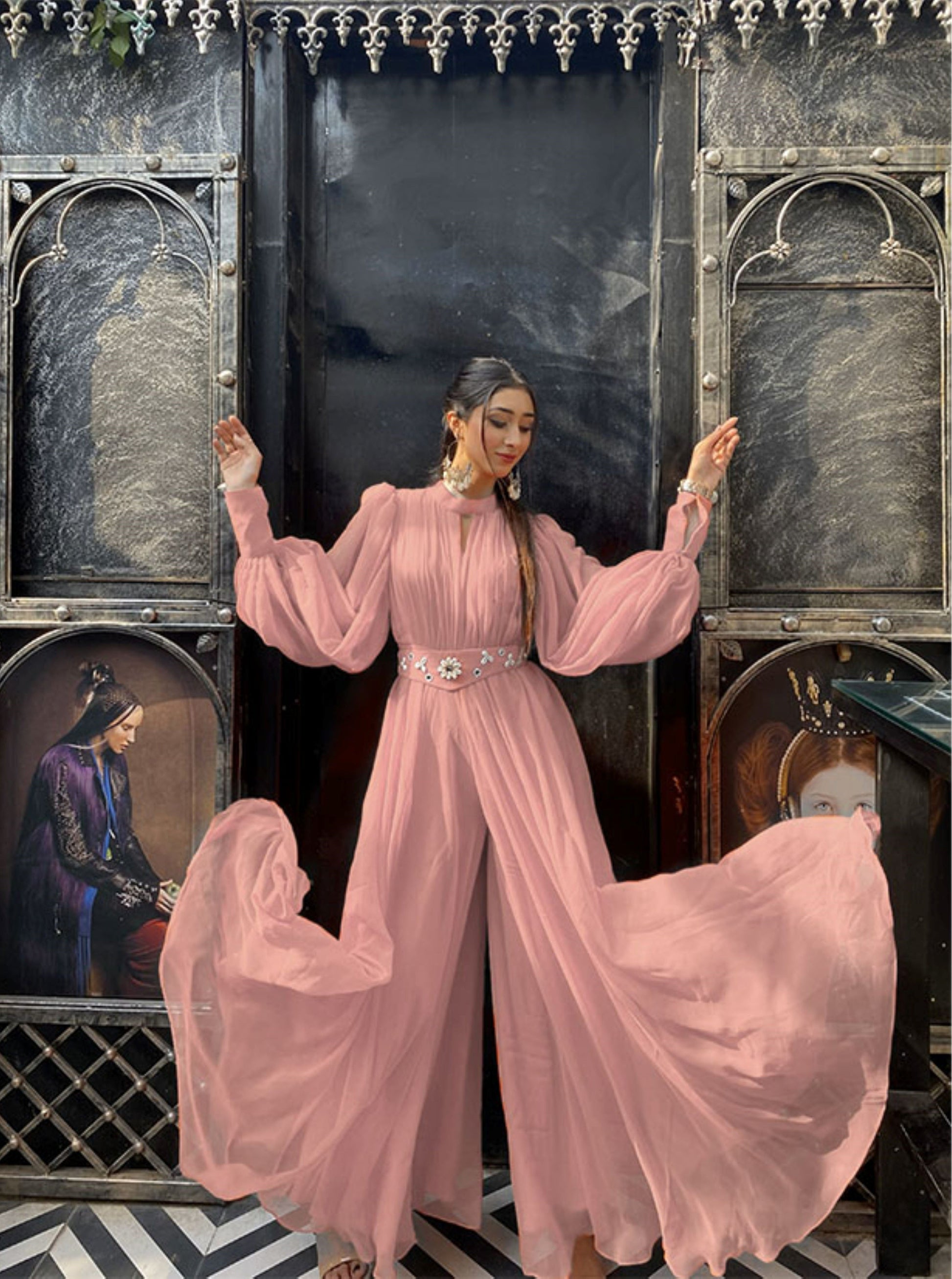 A jumpsuit made of pure Georgette material with a detachable belt handcrafted with shells for an elegant touch.