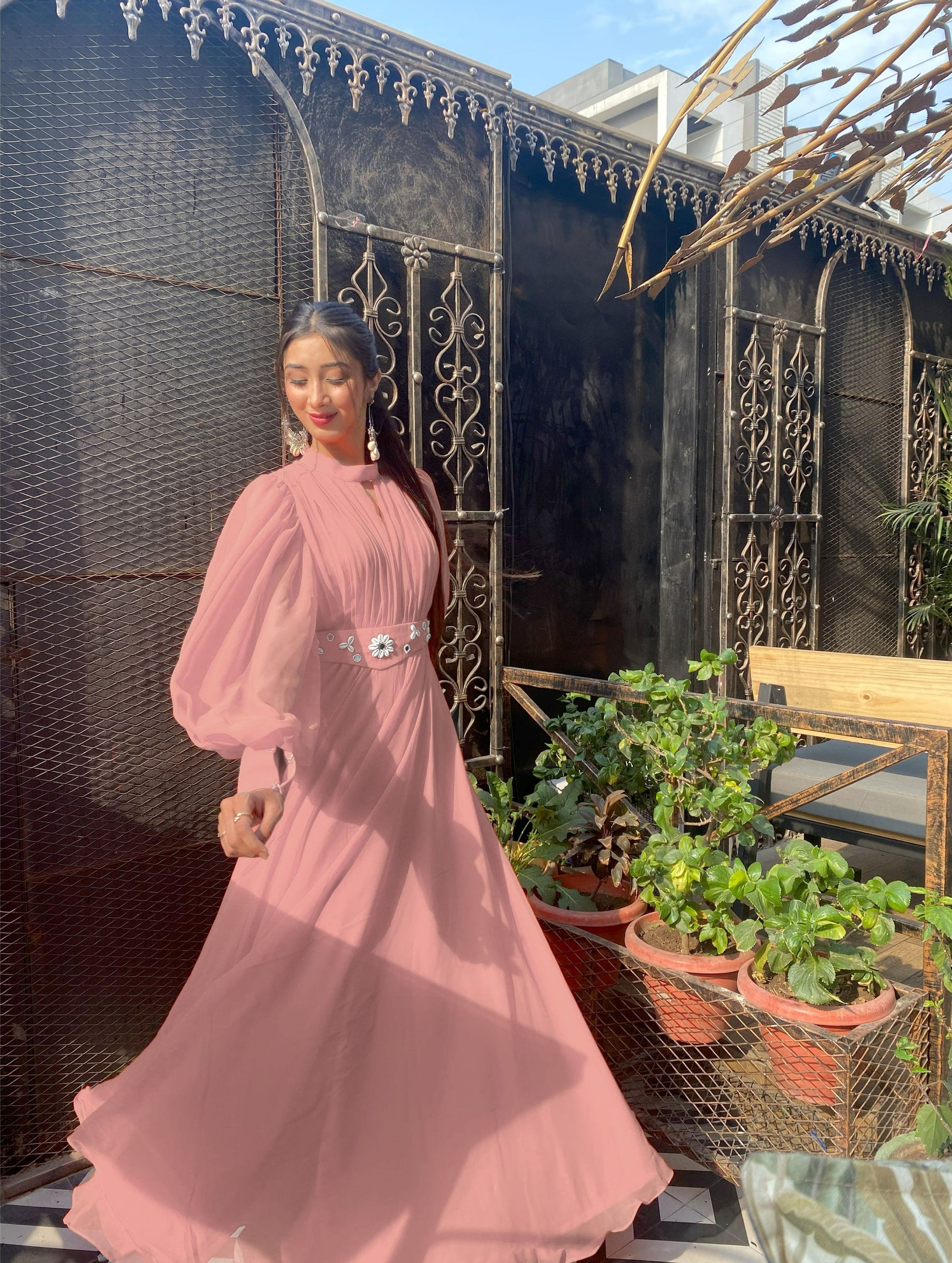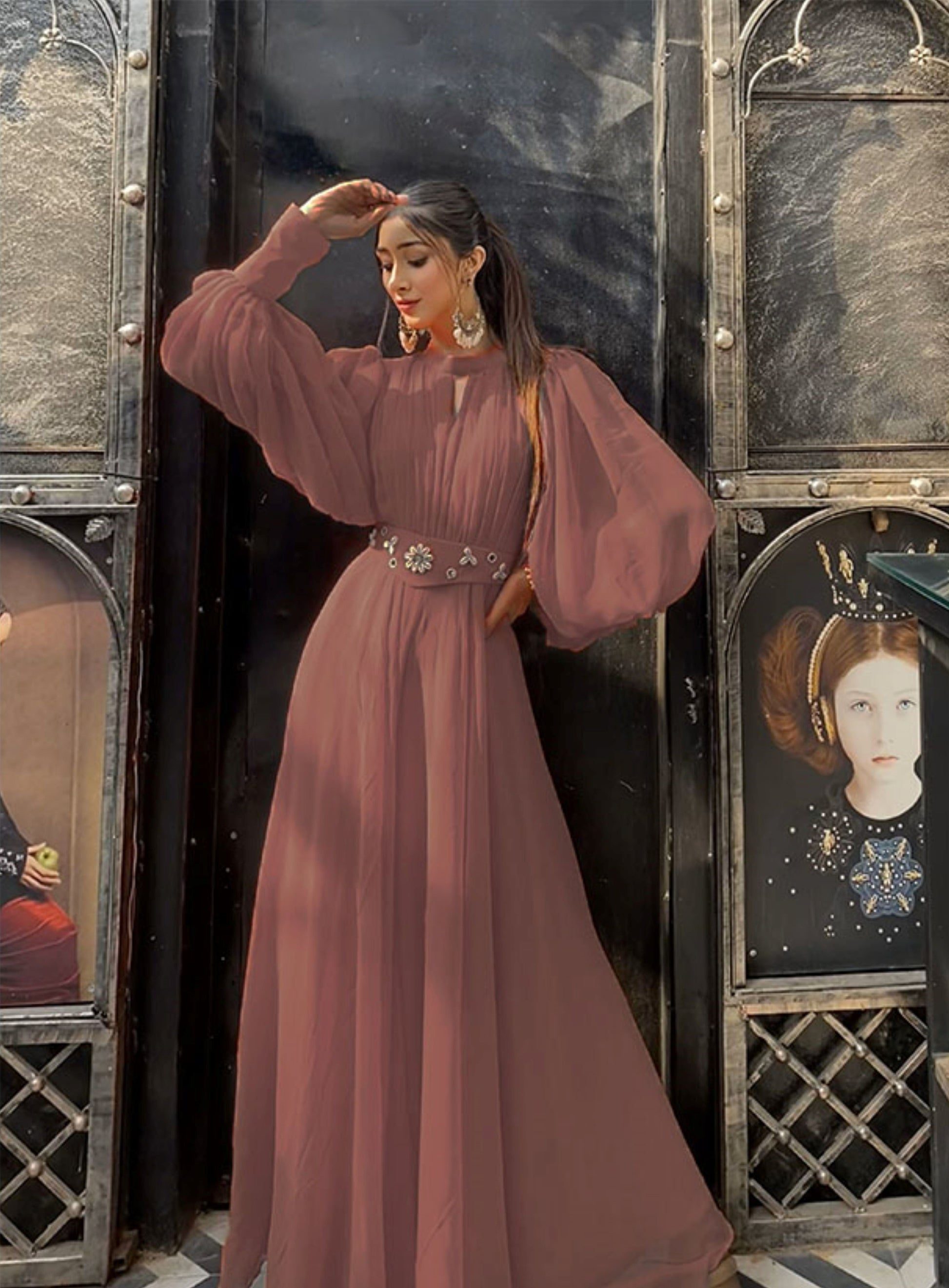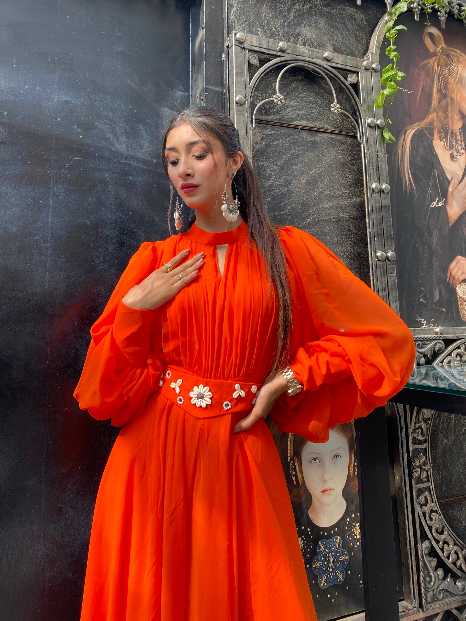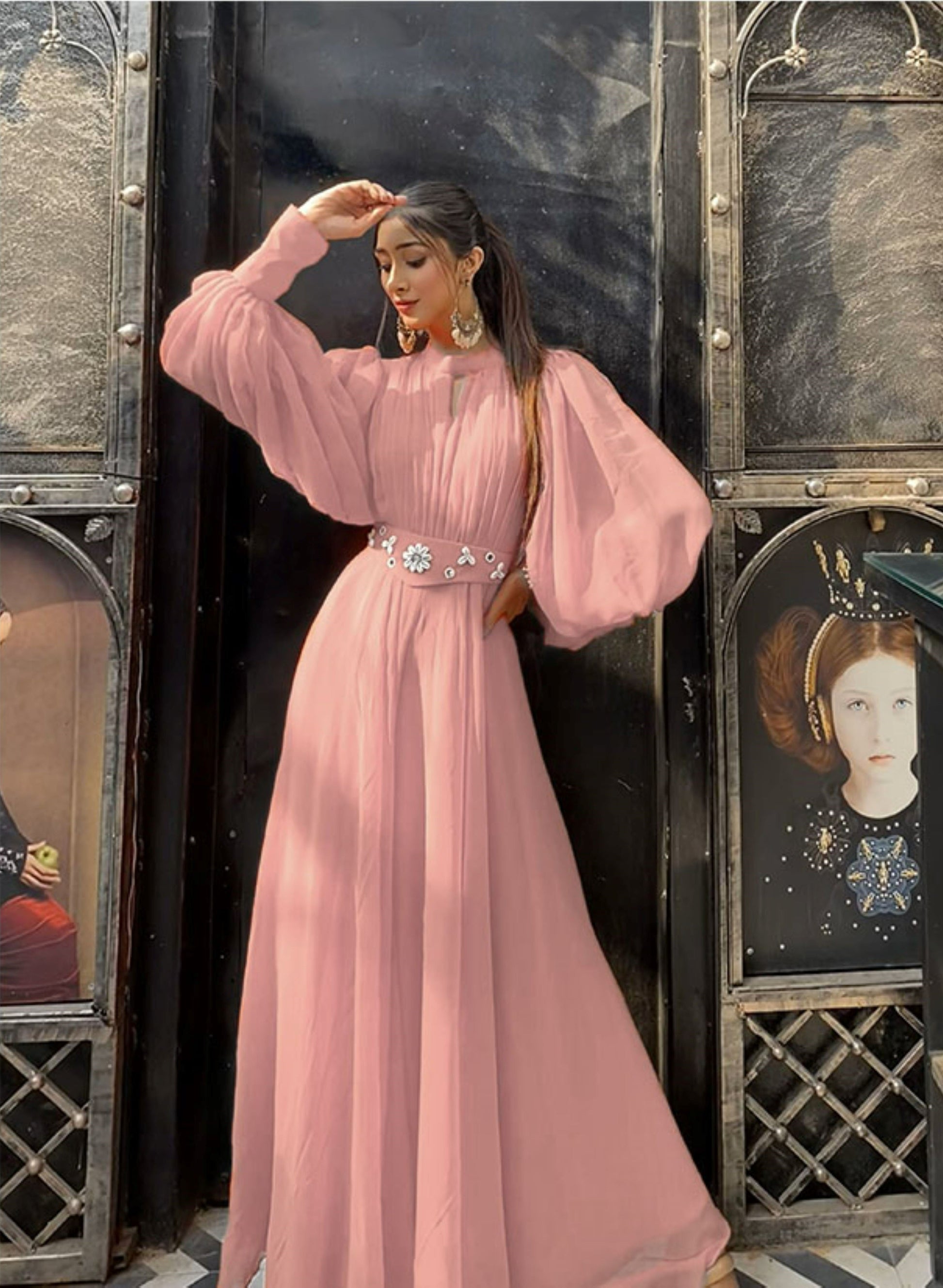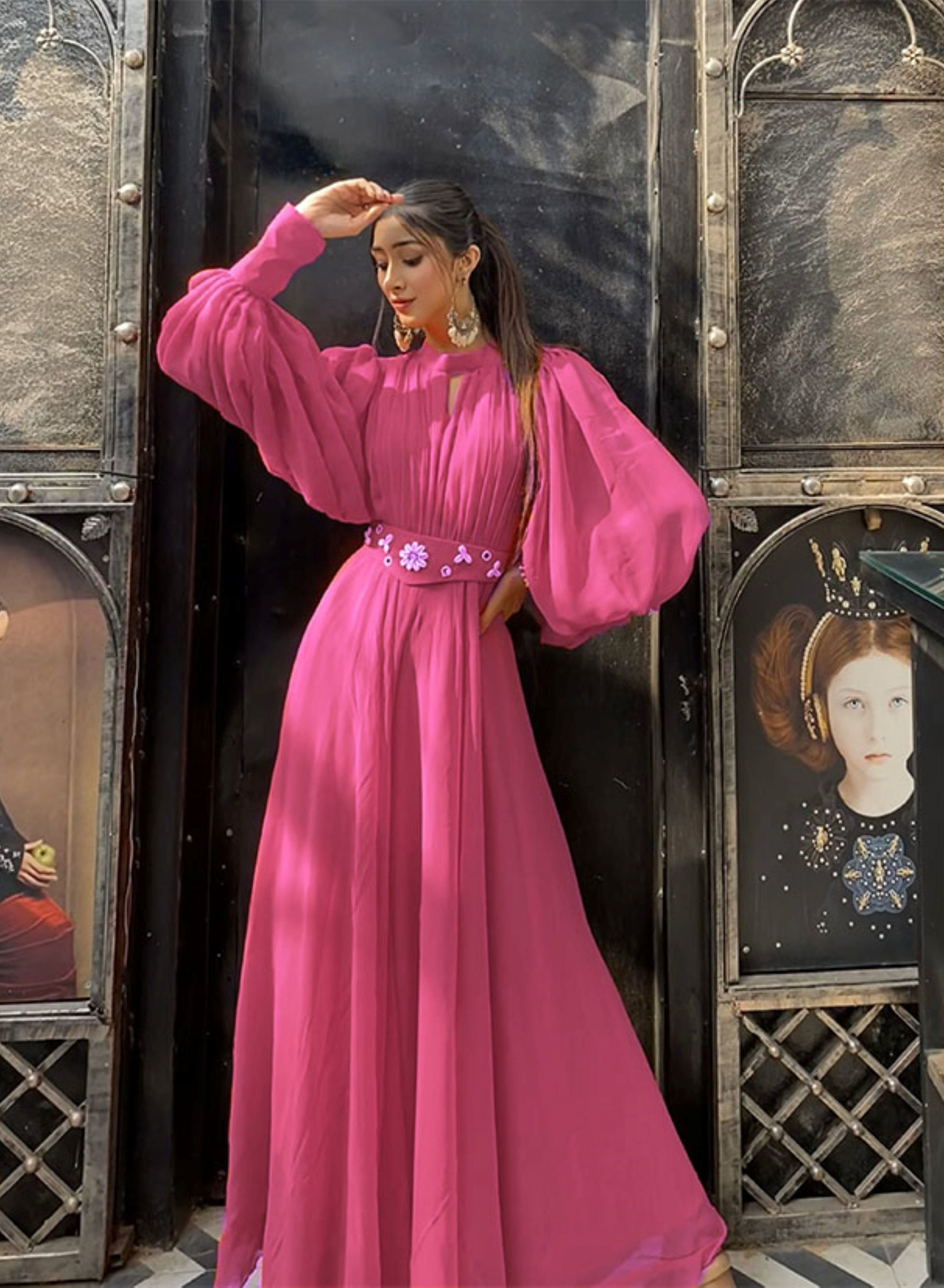 A jumpsuit made of pure Georgette material with a detachable belt handcrafted with shells for an elegant touch.
