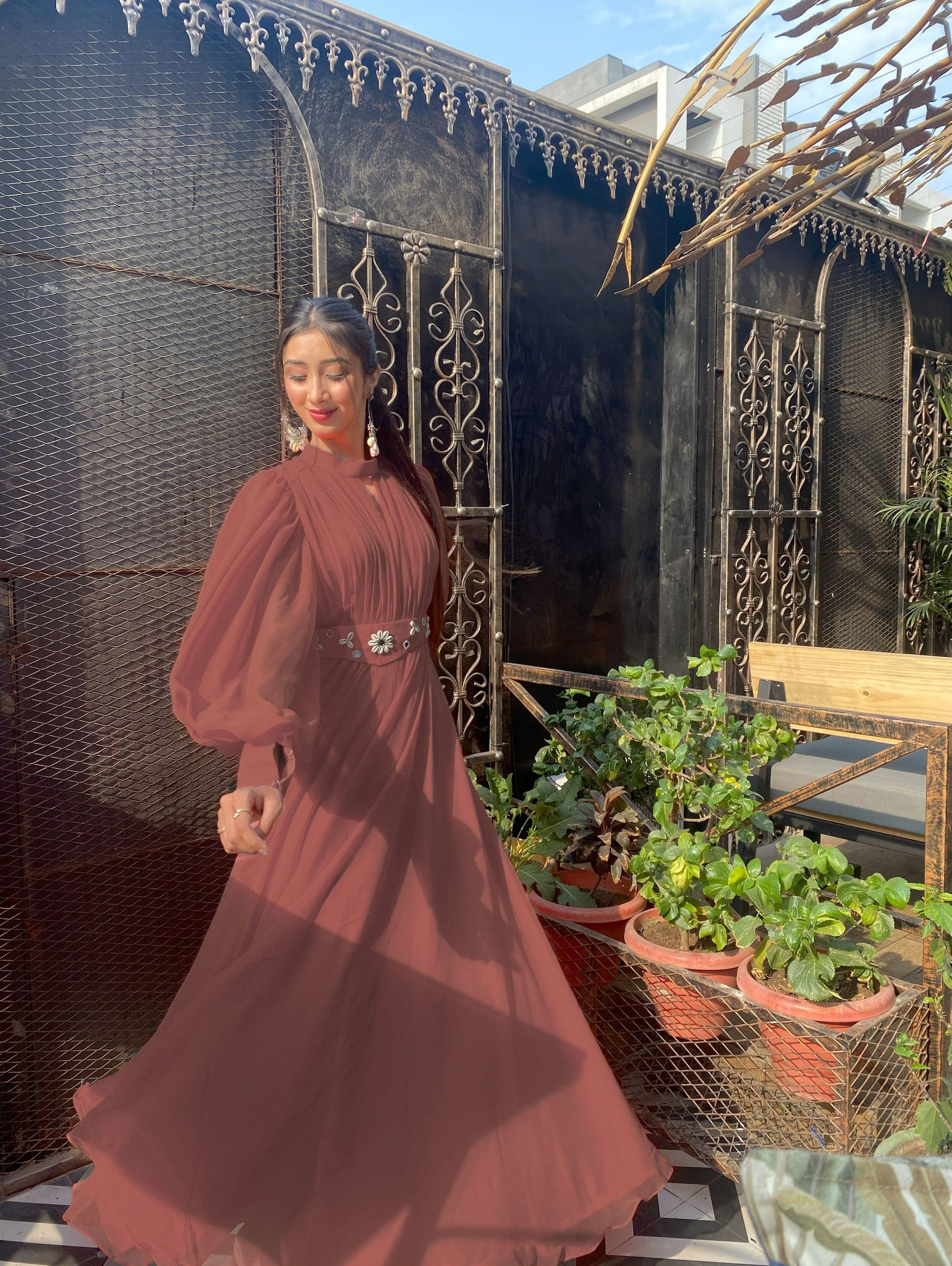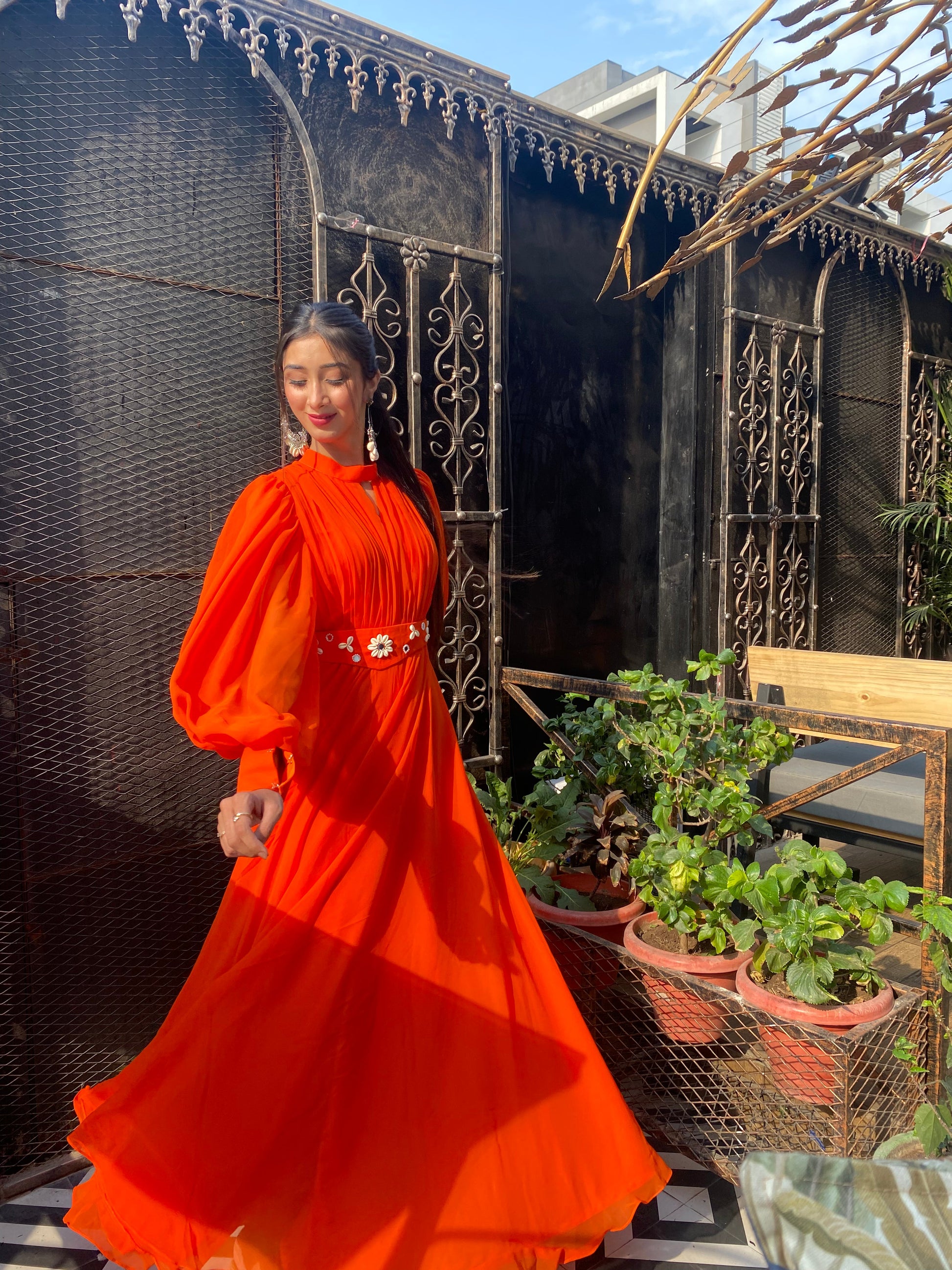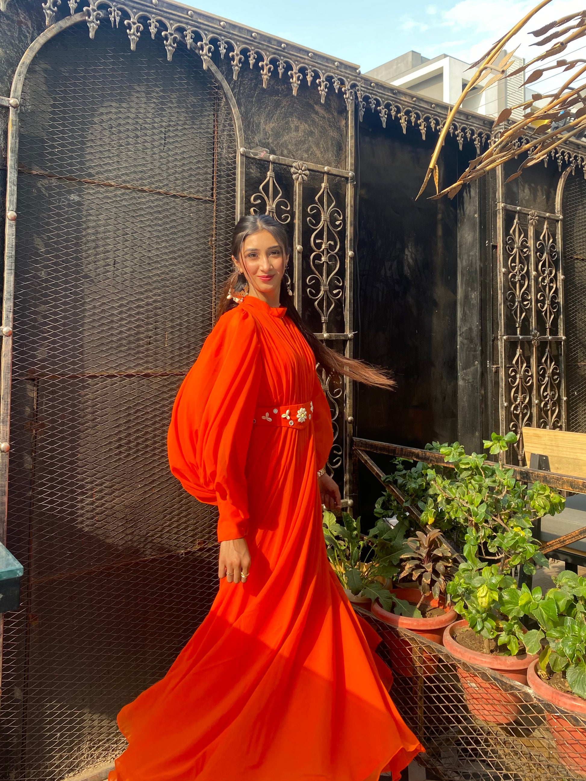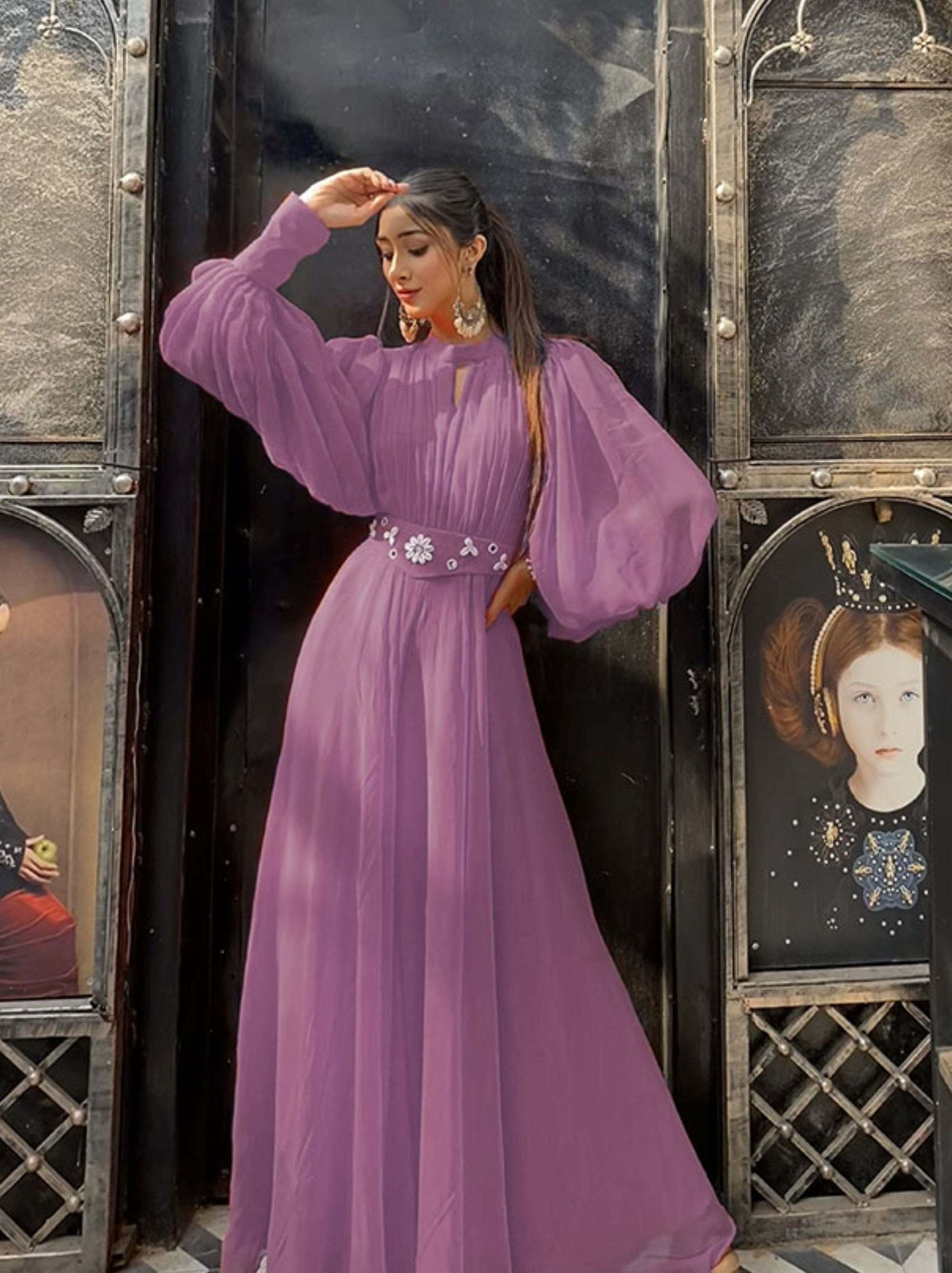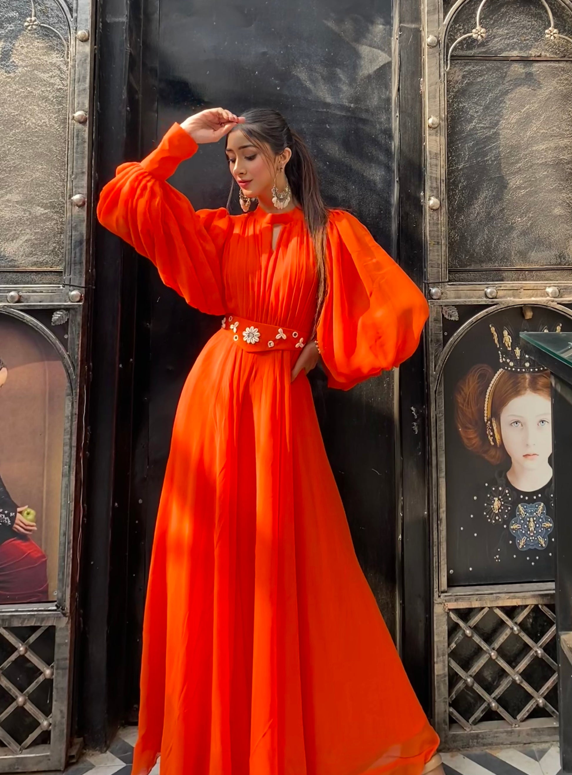 A jumpsuit made of pure Georgette material with a detachable belt handcrafted with shells for an elegant touch.