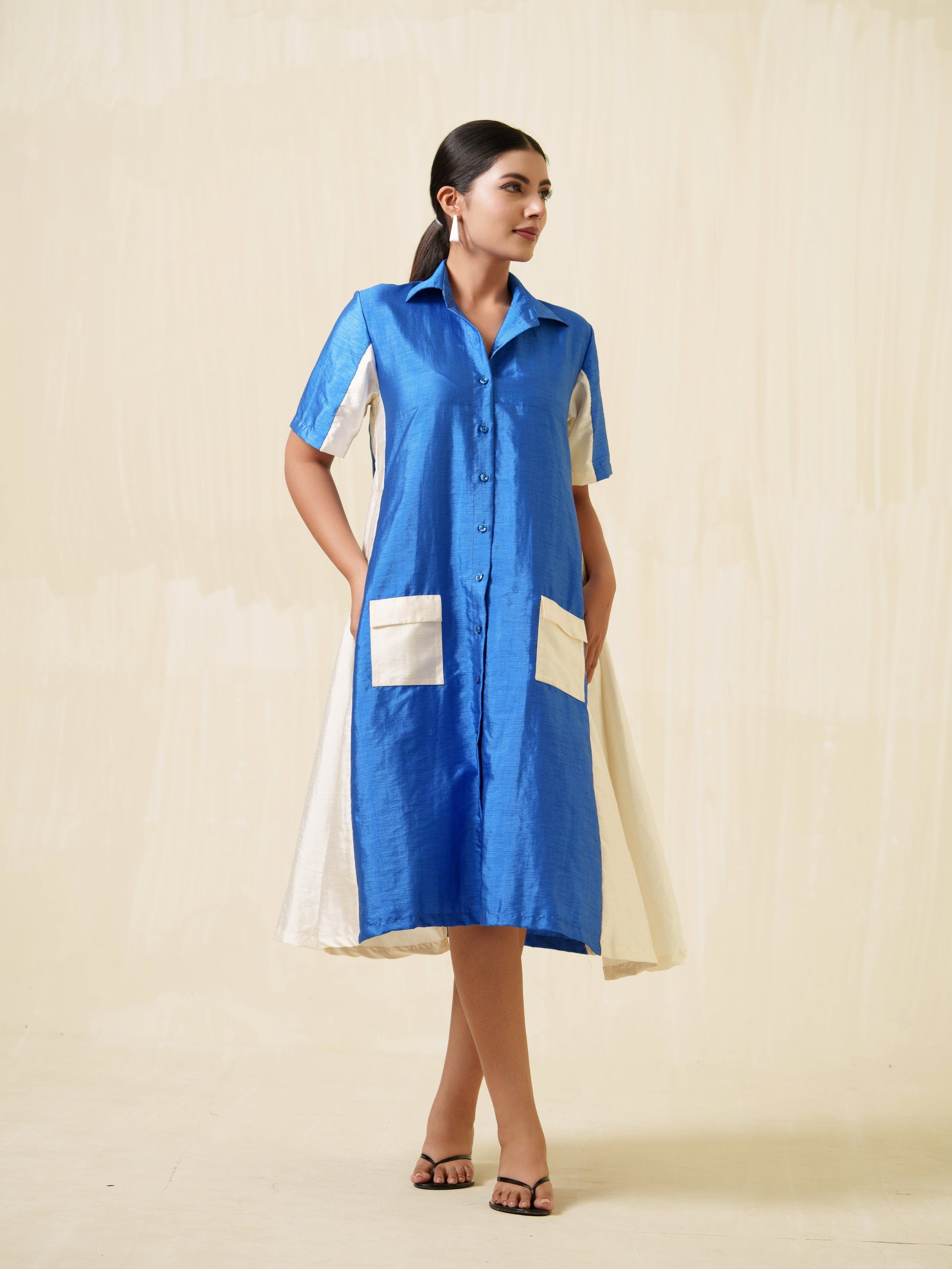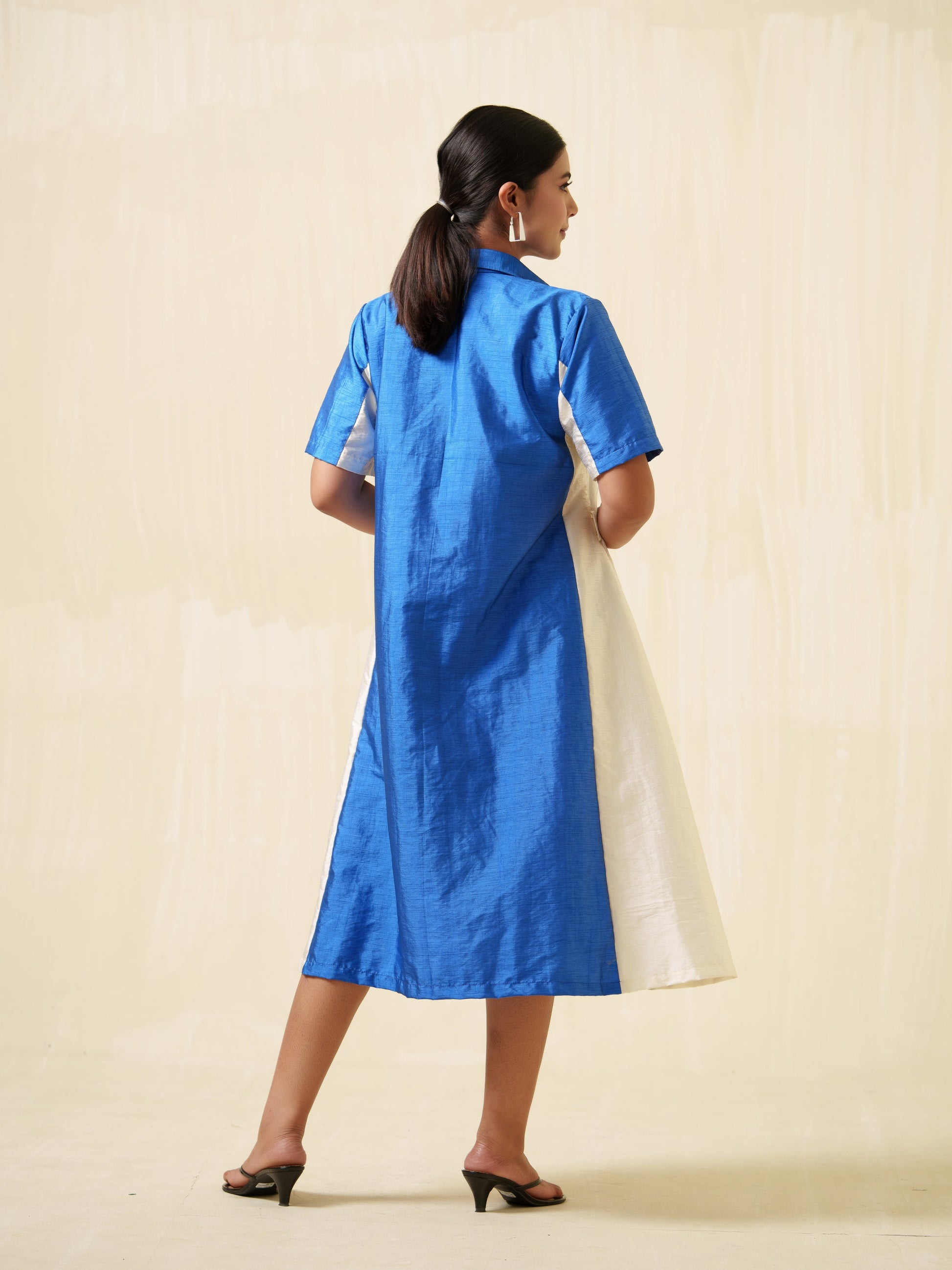This striking color-blocking dress with vibrant hues seamlessly blend to create a statement piece that exudes contemporary style and confident flair.